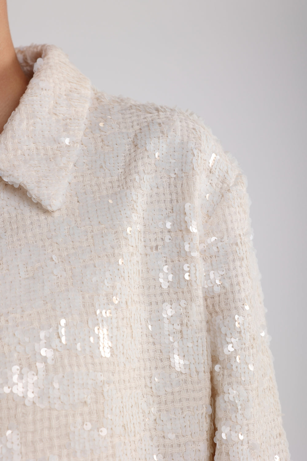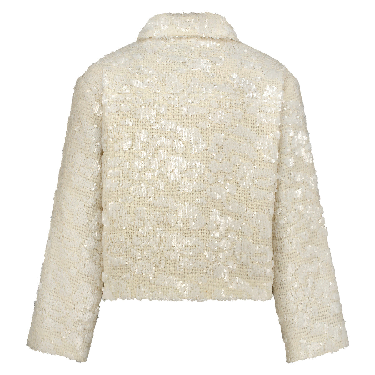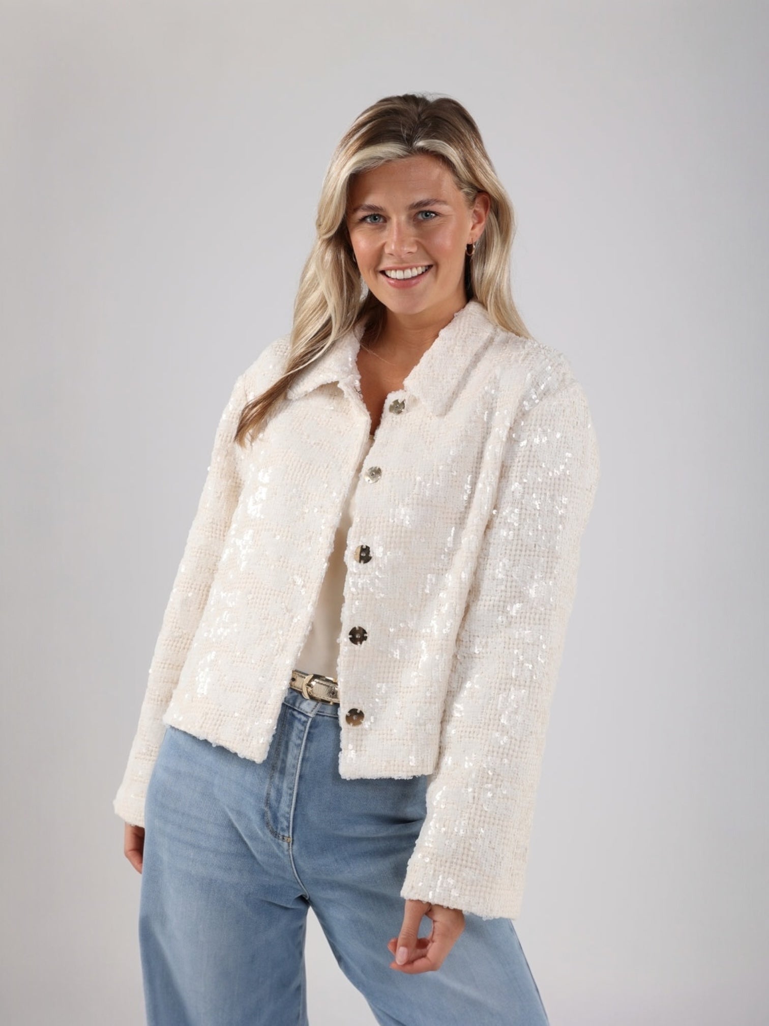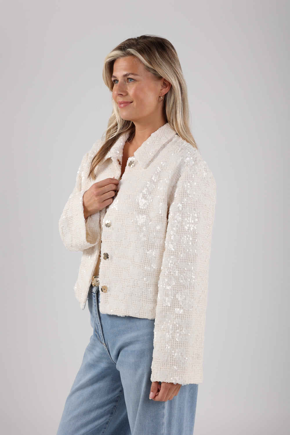 Voeg een vleugje glamour toe aan je garderobe met dit schitterende off-white jasje. De all-over pailletten en klassieke kraag geven het een stijlvolle uitstraling, terwijl de knoopsluiting aan de voorkant zorgt voor een elegante afwerking. Perfect te combineren met een basic top en jeans voor een speelse touch of met een chique pantalon voor een verfijnde look. Een echte eyecatcher voor elke gelegenheid!