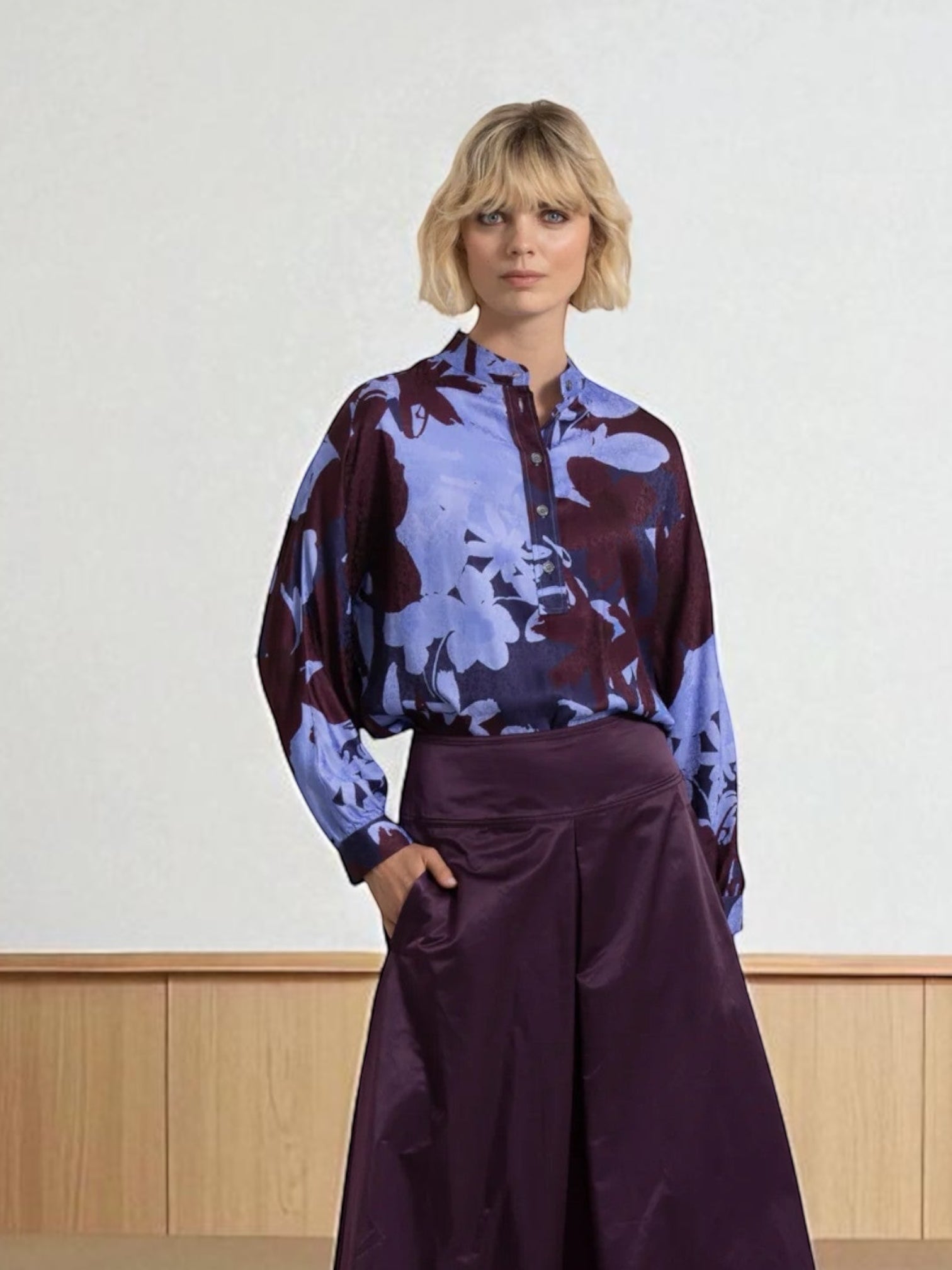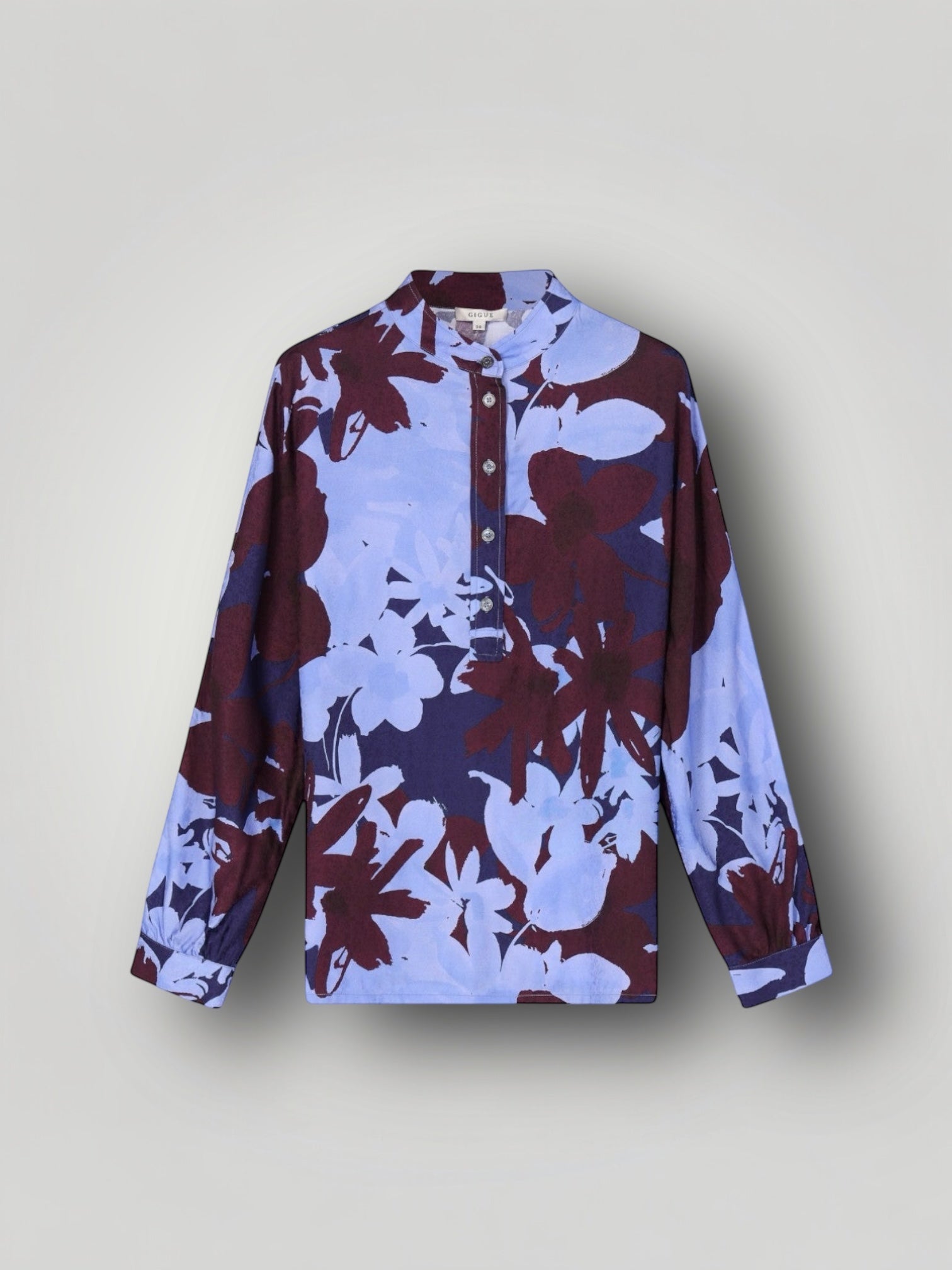 Deze luchtige jacquard viscose blouse valt soepel rond het lichaam en straalt pure finesse uit. De subtiele glans in de stof geeft net dat tikkeltje extra, terwijl de bloemenprint in warme blauw- en bruintinten zorgt voor een zachte, maar krachtige uitstraling.