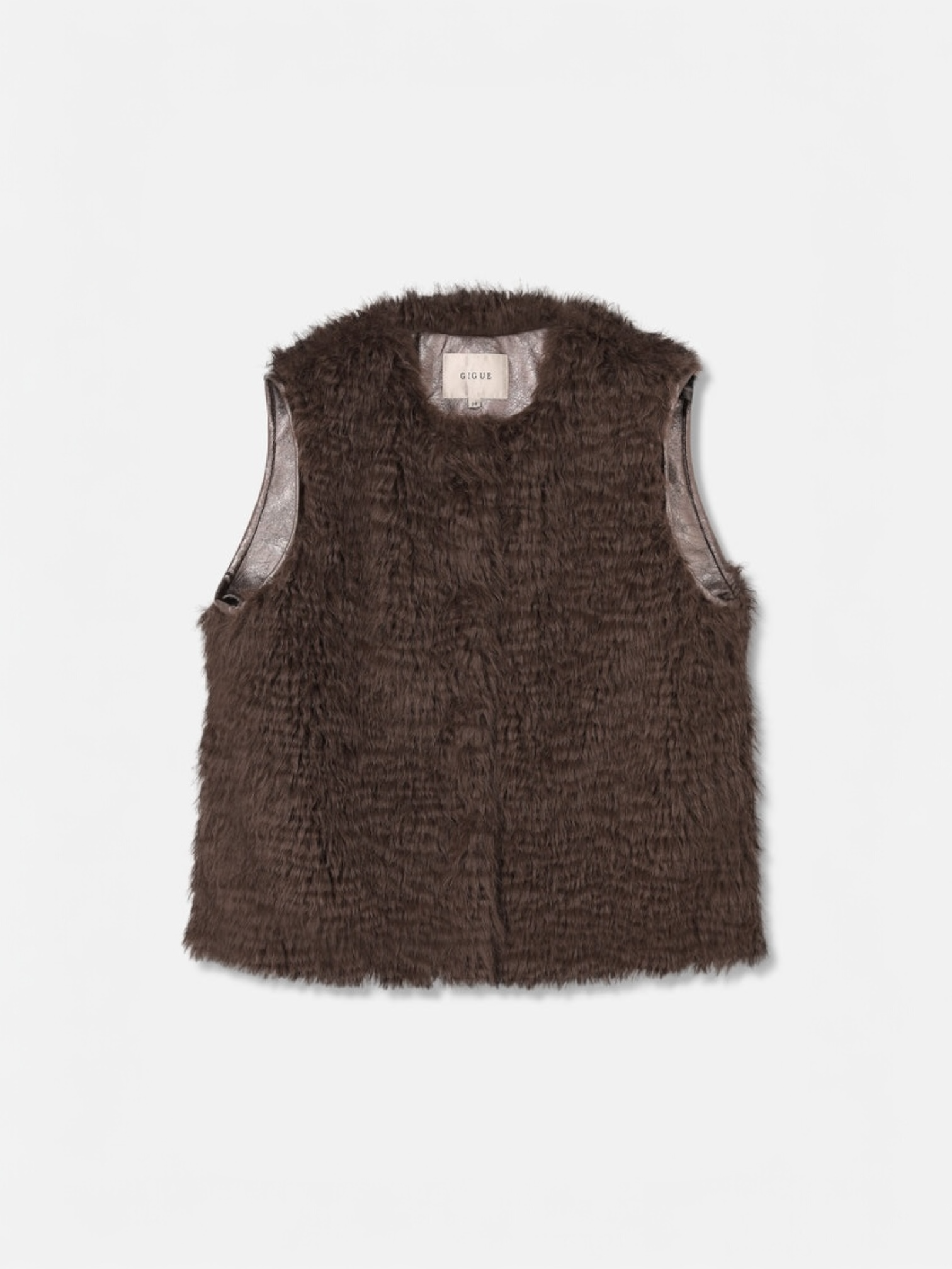 Mouwloos jasje in zachte fake fur, afgewerkt met stijlvolle lederlook details.