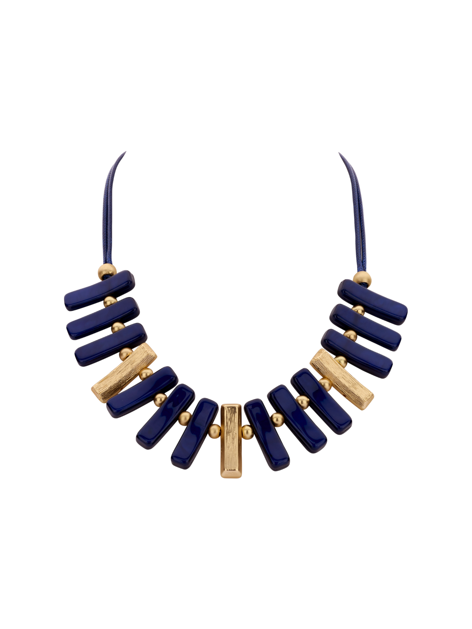 Een elegante korte ketting in blauw met verfijnde goudaccenten. Tijdloos, licht en perfect om elke outfit net dat tikkeltje extra te geven.
