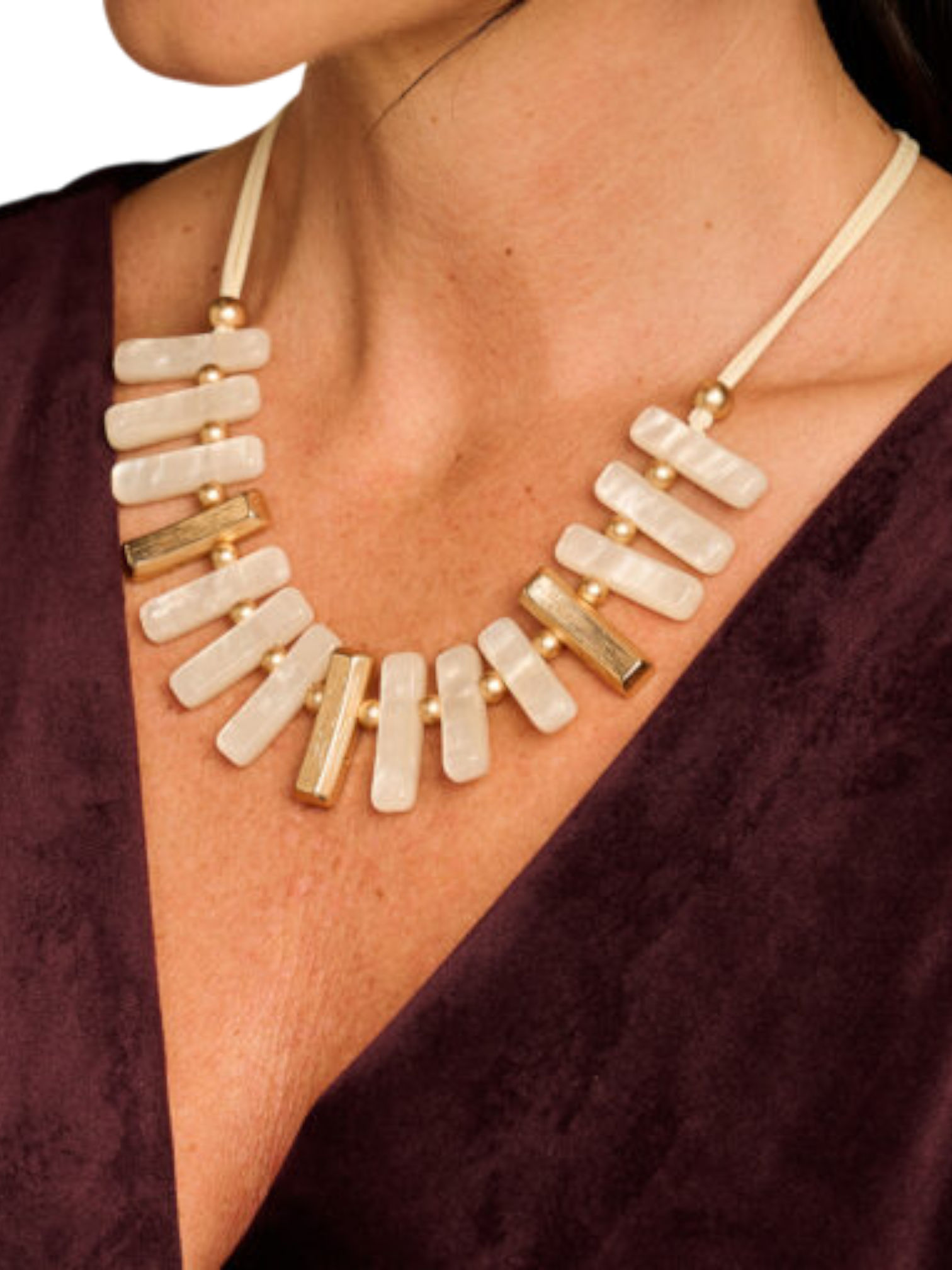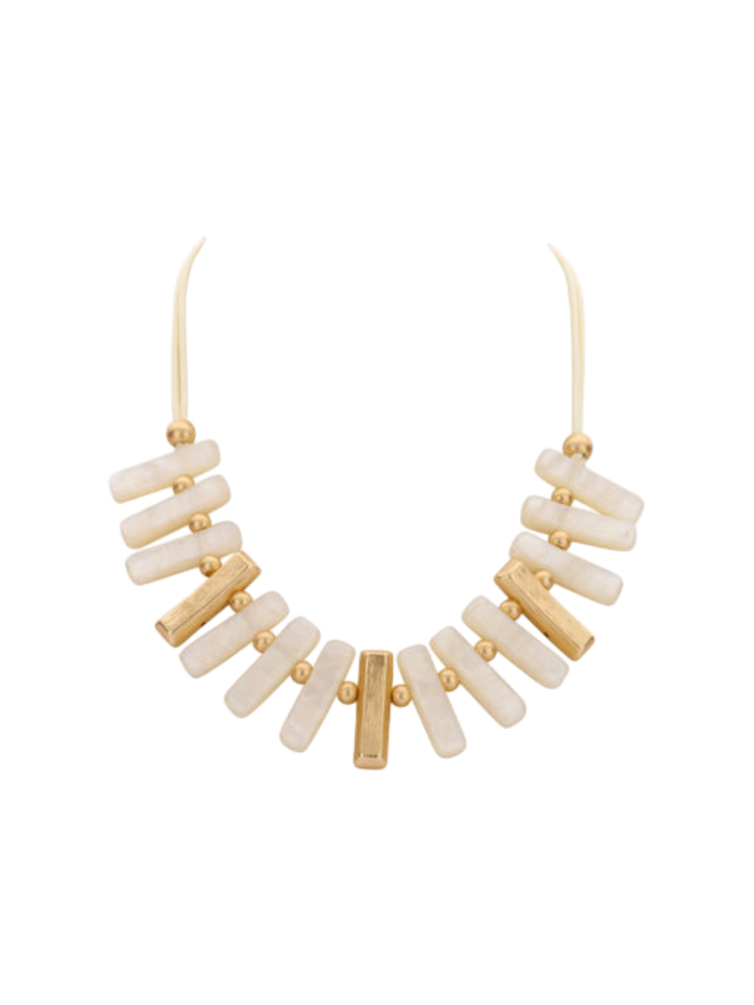Een elegante korte ketting in ecru met verfijnde goudaccenten. Tijdloos, licht en perfect om elke outfit net dat tikkeltje extra te geven.