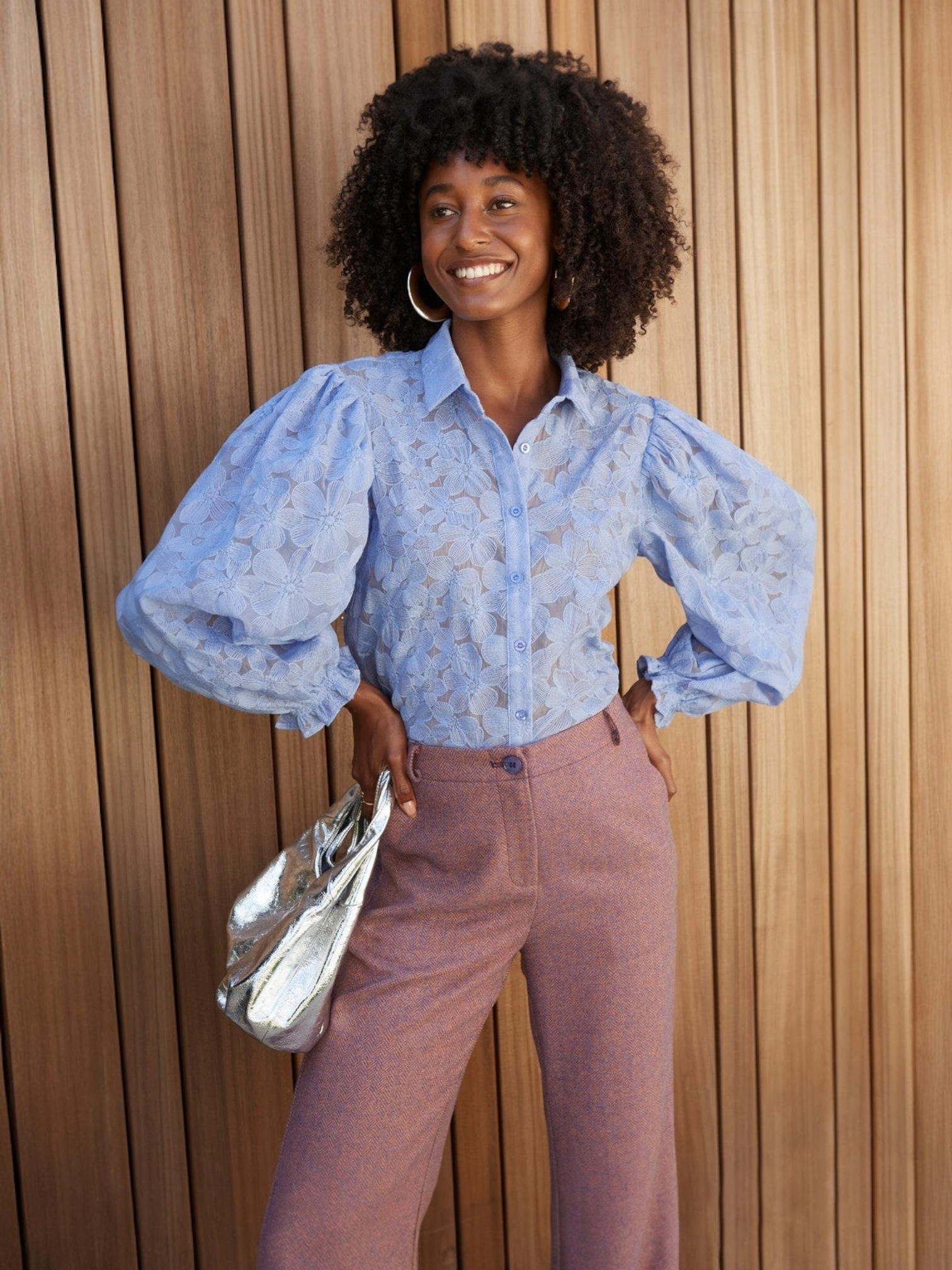 Birdie is een leuke bloes met prachtige geborduurde bloemen in semi transparante stof. De bloes heeft een licht getailleerde pasvorm, pofmouwen, een kraagje en sluit met een knoopsluiting aan de voorzijde.