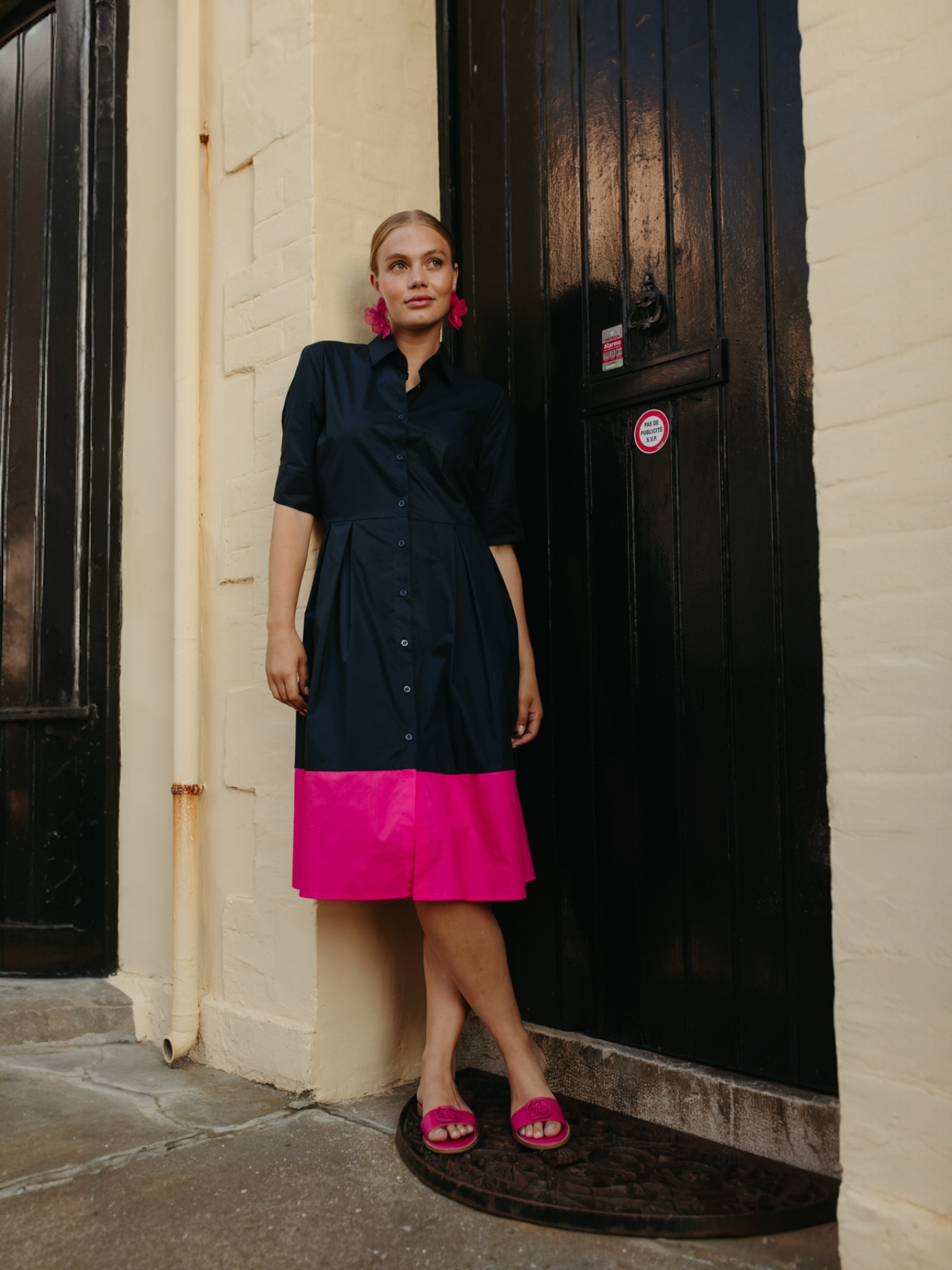 Het tijdloze navy wordt op een speelse manier doorbroken door een opvallende fuchsia kleurblok aan de zoom, wat zorgt voor een verrassend en modieus effect.