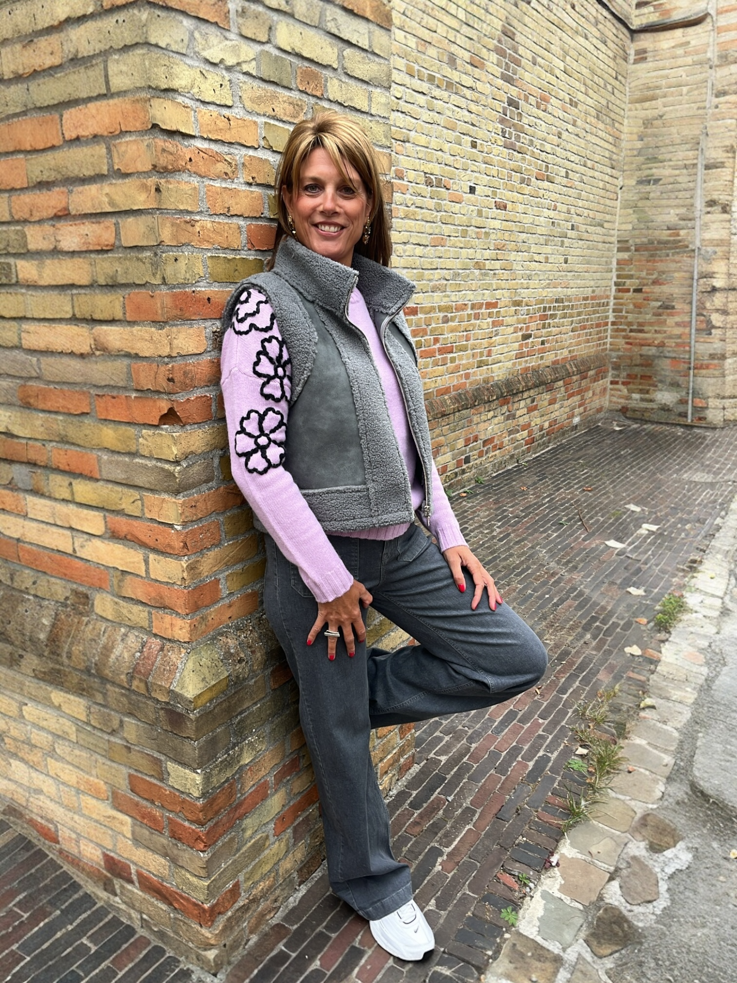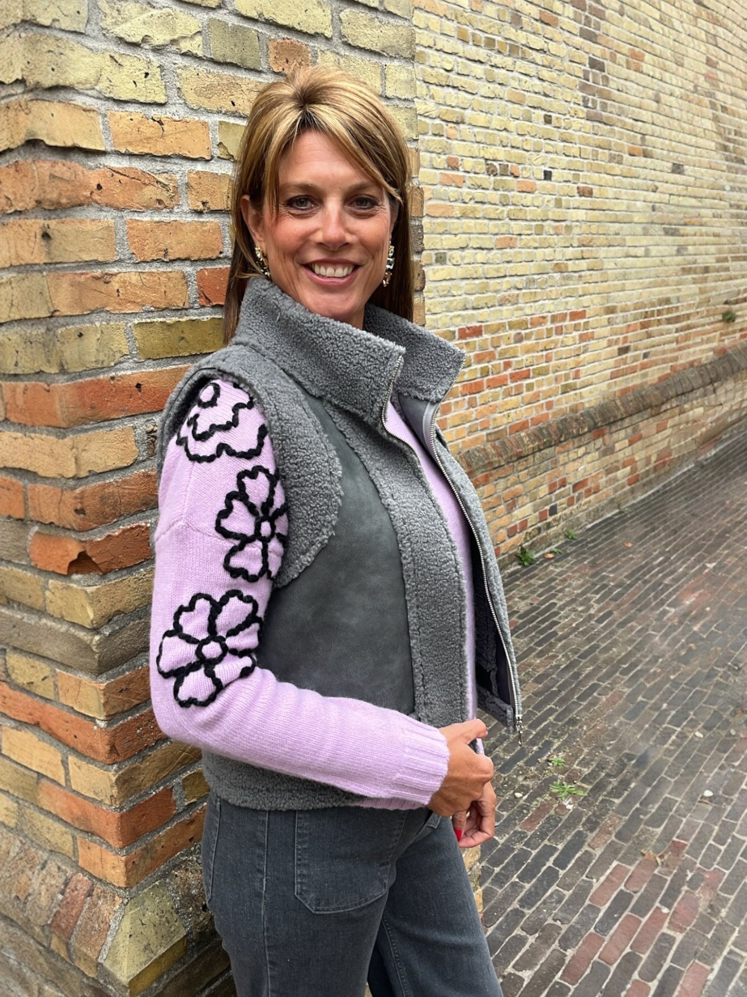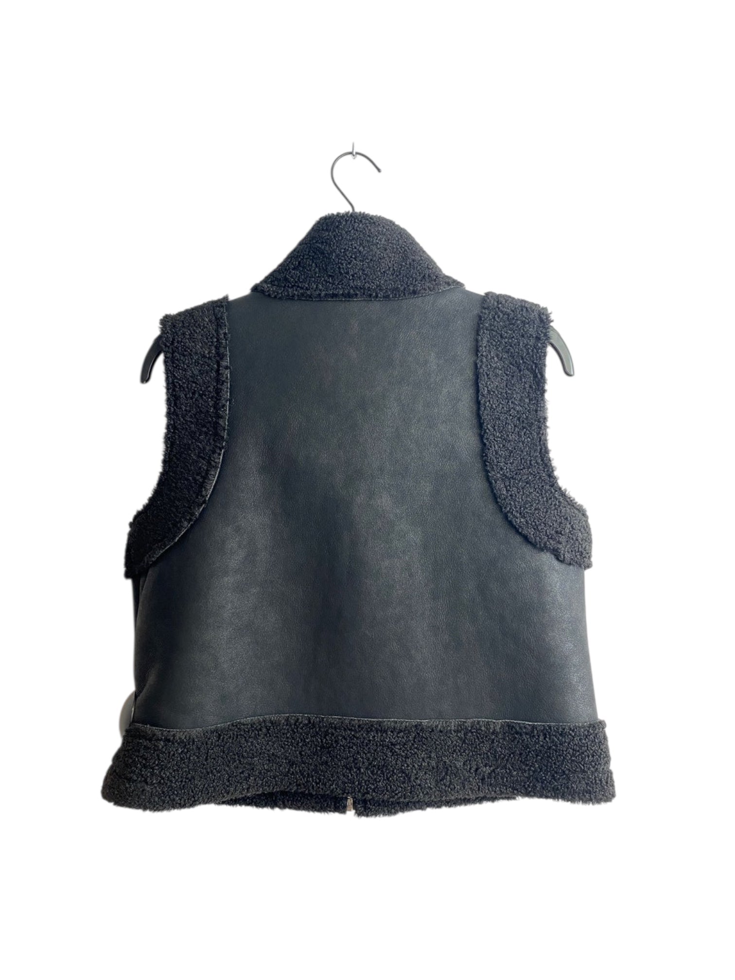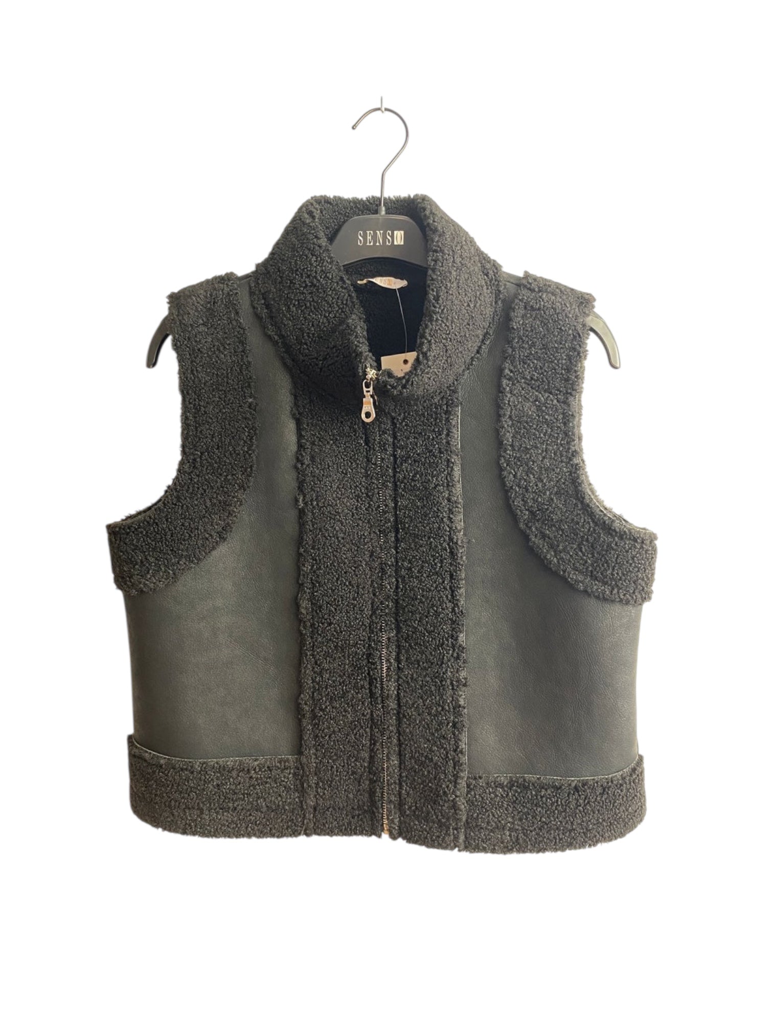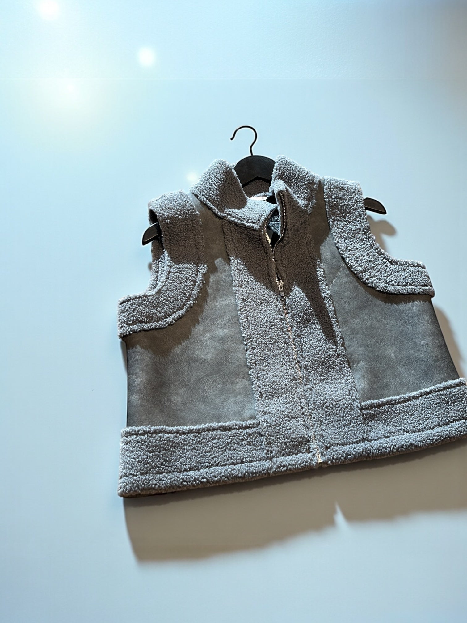 Mouwloos grijs vestje in teddy gecombineerd met soort zeemvelstofje. Superknap en eindeloos te combineren met een bloes of pull eronder.