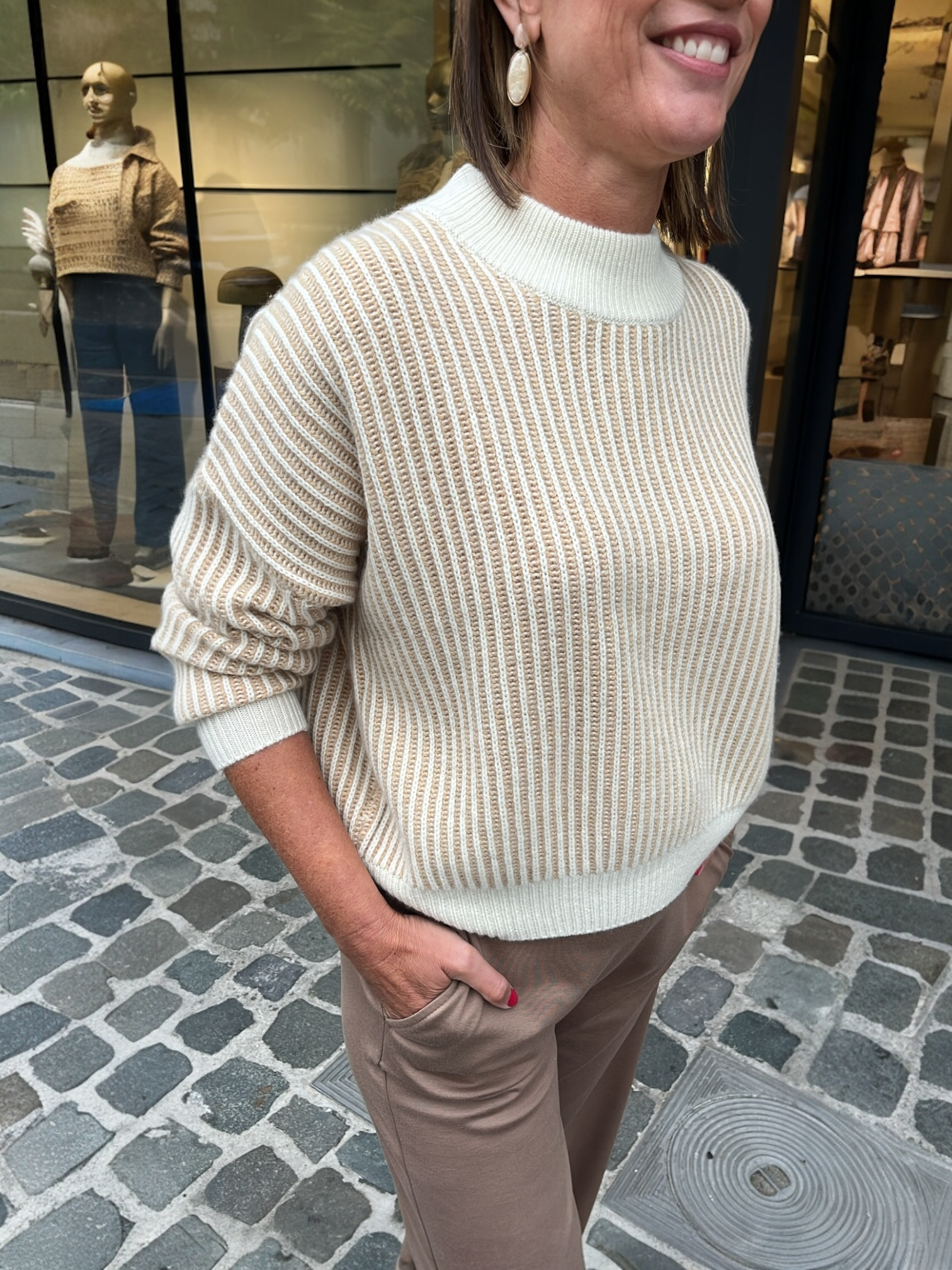 Comfort en elegantie komen perfect samen in de oversized JESSICA trui, vervaardigd uit een zachte mix van wol en kasjmier en afgewerkt met subtiele contrasterende strepen. De luxueuze stof voelt warm en aangenaam aan, maar blijft licht — ideaal voor het tussenseizoen én de winter. Dankzij de losse pasvorm en de moderne opstaande kraag straalt deze trui een casual, maar tegelijk tijdloze klasse uit. Mooi te combineren met een jeans, rok of broek — een verfijnd en onmisbaar item in elke garderobe.
