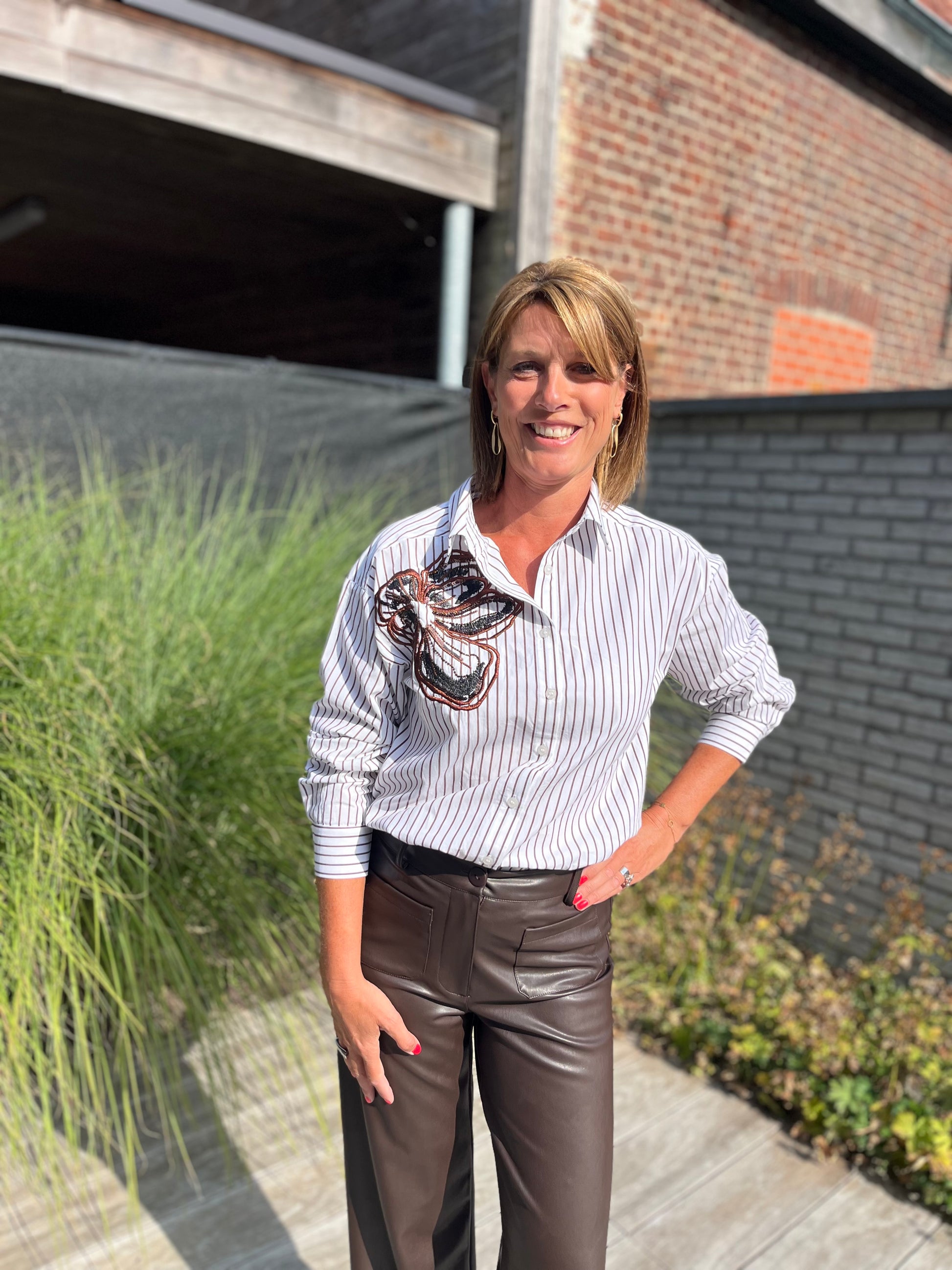 Witte bloes met bruine streepjes en knap schouderdétail van het merk Senso