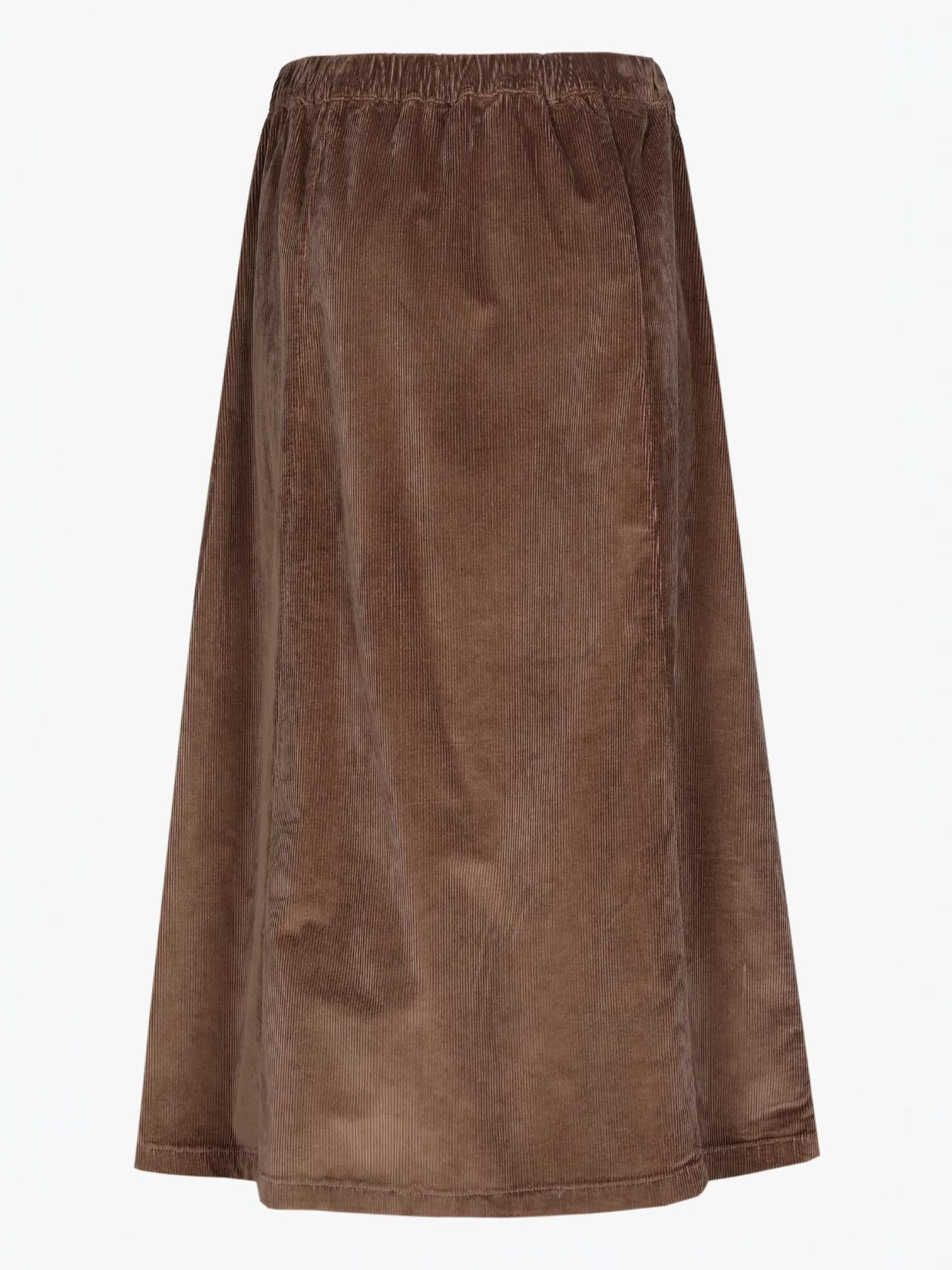 Ontdek deze stijlvolle lange rok in ribfluweel – een must-have voor wie houdt van elegantie en comfort. De rok heeft een A-lijn model met een verfijnde springplooi vooraan en een elastische taille achteraan die zorgt voor een perfecte pasvorm.